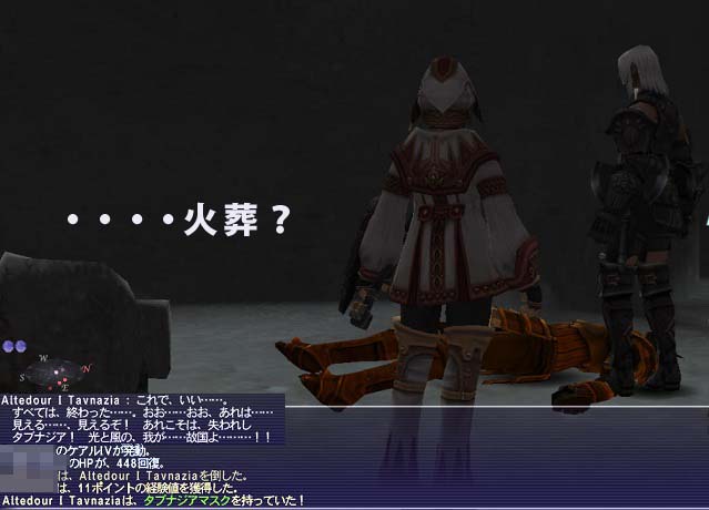 (写真をclickすると拡大します)はなかなか泣かせるものがありますが、これを殴る蹴るした挙句に死体から装備品(タブナジアマスク)剥がすってなんだかなぁ……とても白魔道士の所業とは思えない;