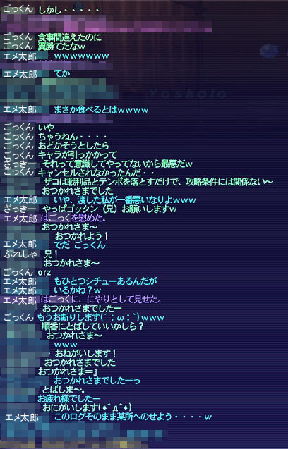(現状のようなエコーズを続行するかわからないというだけで、解散するというものではありません。新コンテンツの実装もあるらしいので、同じメンツで“集まったらふらっと遊びにいく”スタンスは変わらないと思います。……が、鯖移行によるLS解体の問題もあるので、自然消滅みたいななし崩し解散にならなきゃいいなぁ、と心配するのみです)