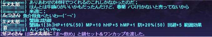 命中上がるのはいいものの、回避マイナスって……「勝つ気あるのかキサマ」と/slapされるかと思いましたが、待ち時間が長い中、ゼフィさんがお酒を用意してくれるなど、前衛・後衛全員で鍋をつついたのでありましたw